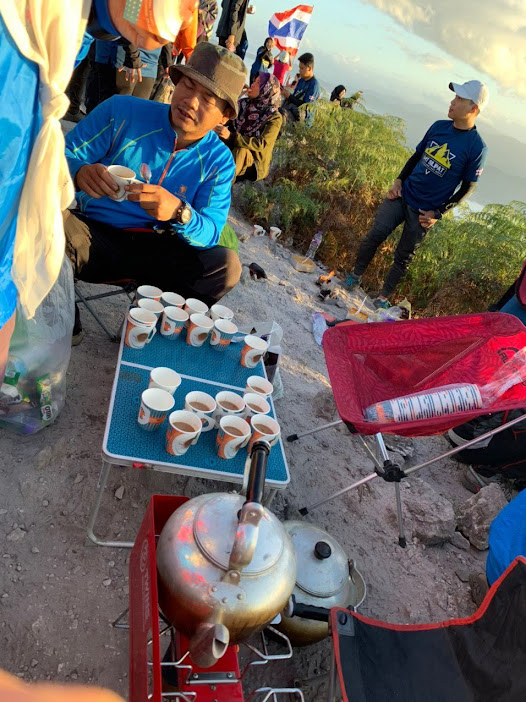 Sarapan disediakan oleh kru Gunung Hub. Lokasinya amat istimewa. Betul-betul di puncak gunung. Walau pun sarapan kami ringkas, hanya berhidangkan roti bakar dan air minuman 3 dalam 1 sahaja, namun usaha untuk membawa menu pemakanan termasuk kelengkapan memasak untuk dinikmati seramai 40 orang adalah satu usaha yang terpuji. Tentunya lebih mudah sekiranya sarapan dinikmati di tapak perkhemahan sahaja. Namun demi memberi pengalaman kepada pelanggan untuk menghirup kopi panas sambil menikmati pemandangan yang indah, segala beban yang digalas untuk sampai ke puncak mampu tiba lebih awal dari kami sebagai peserta.